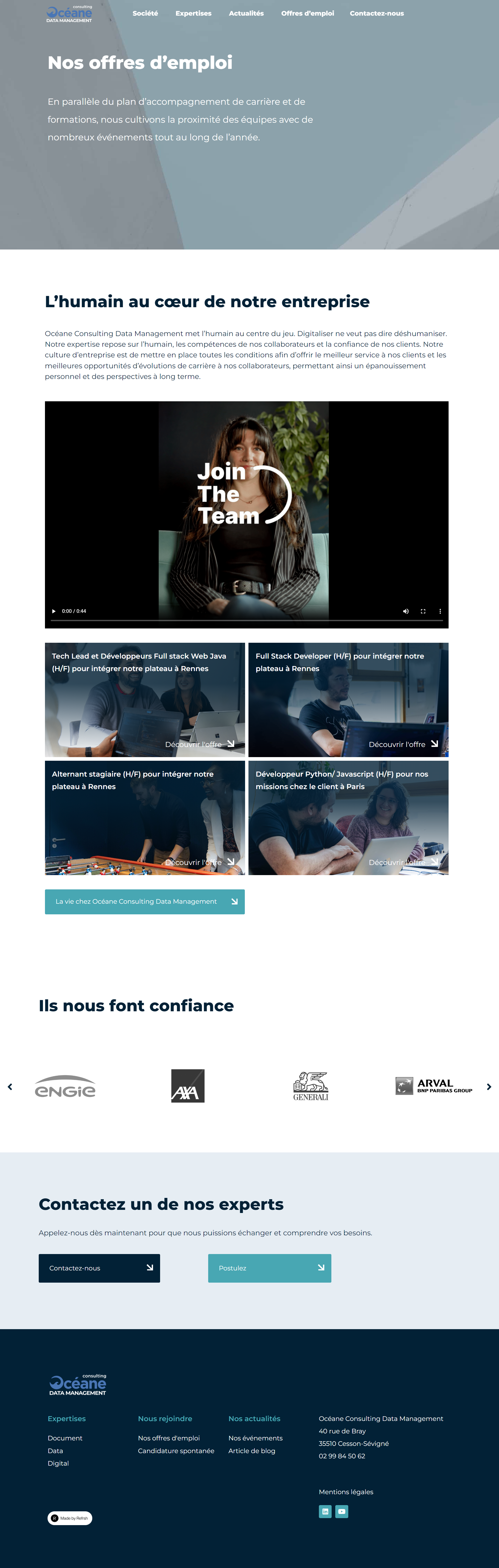 En tant que développeuse web, j’ai réalisé la reconstruction du site d’Océane Consulting en prenant l’ancien site comme base, tout en répondant au besoin du client de passer d’Elementor à WordPress avec l’intégration d’ACF (Advanced Custom Fields). L’objectif principal de cette transition était de donner au client une meilleure organisation et plus de flexibilité dans la gestion de son contenu, tout en apportant des modifications ciblées sur des éléments spécifiques du site pour améliorer la fonctionnalité et l’expérience utilisateur.