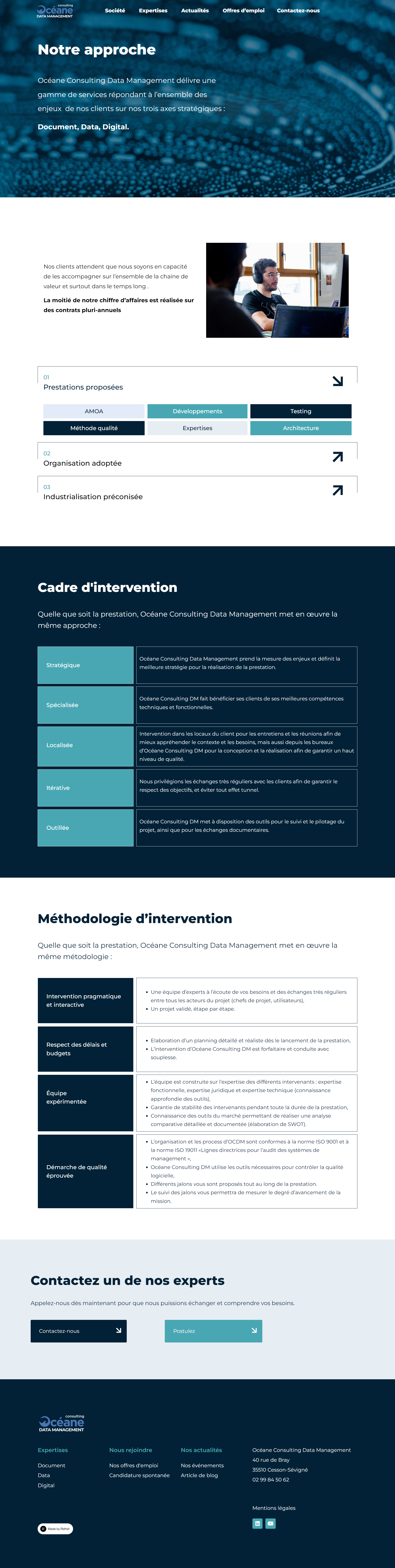 - Optimisation de la mise en page : Nous avons apporté des ajustements précis sur des sections spécifiques pour améliorer la lisibilité et la mise en avant des services phares d’Océane Consulting.